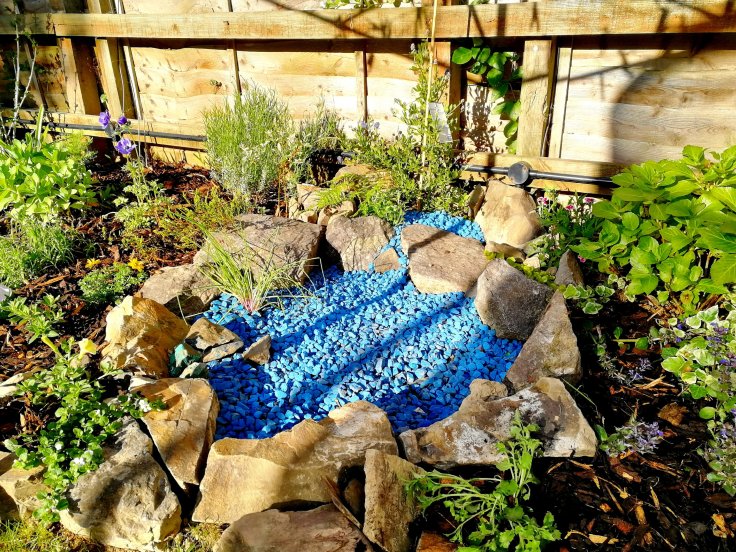 …and our newly-extended “cartoon pond” in the garden rockery; now complete with ferns, a stone waterfall, which will soon have a blue lobelia tumbling over the rocks (a cultivar fittingly named “waterfall) and a backdrop of blue ceanothus covering the fence.