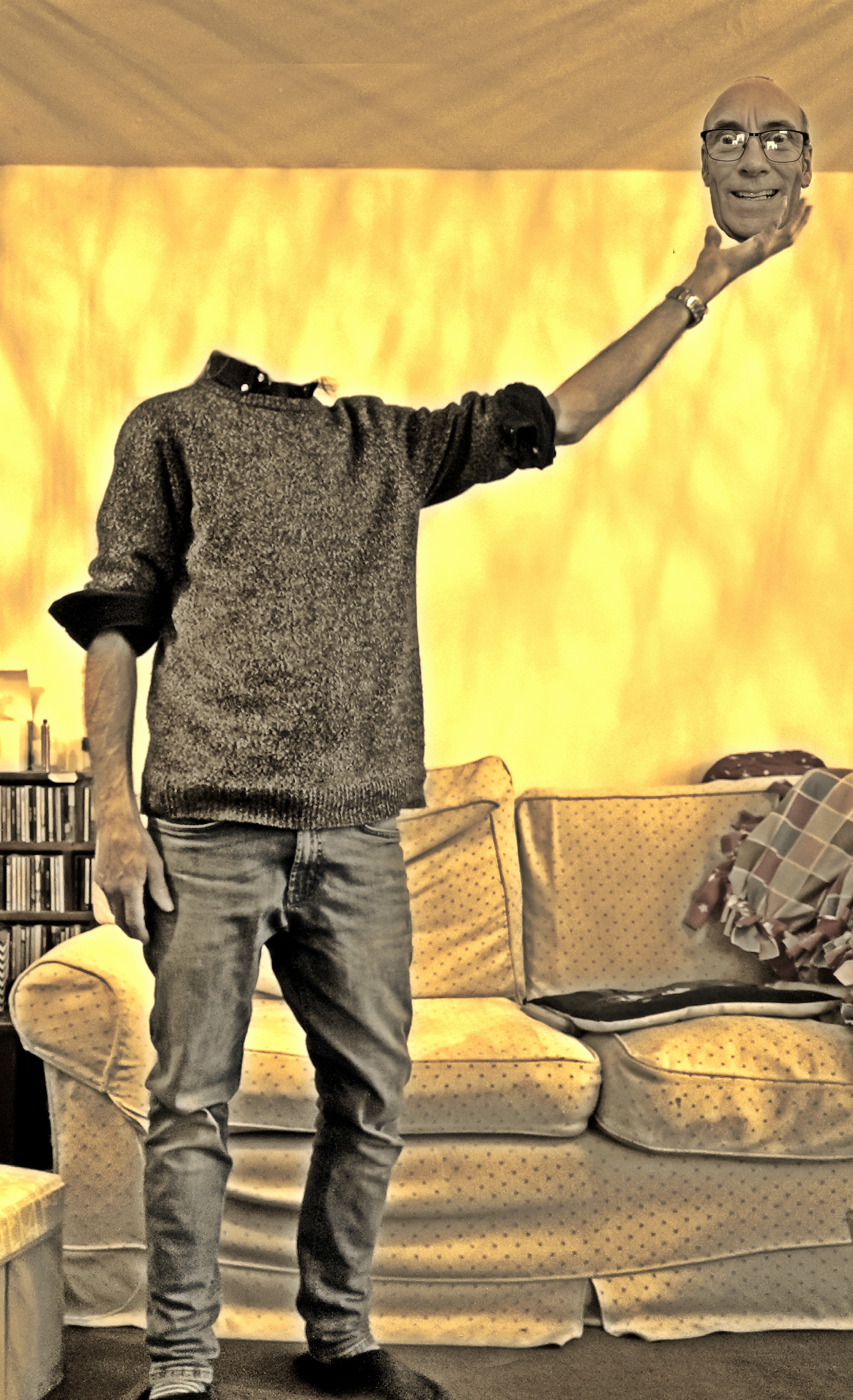I went with one abstract image, made using photos of a wind chime and a peculiar mix of surrealism and pop art which began with an idea for a Hamlet-esque Yorick pose and ended up as something else entirely.